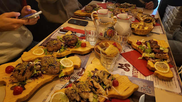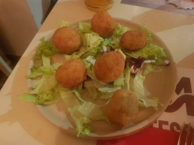 - Polpette di scottona con pecorino, aglio, prezzemolo, cipolletta, uova, caciocavallo, mollica, servite con salmoriglio al limone (olio, limone, aglio, prezzemolo)
