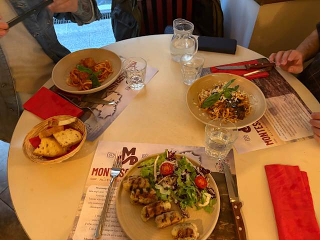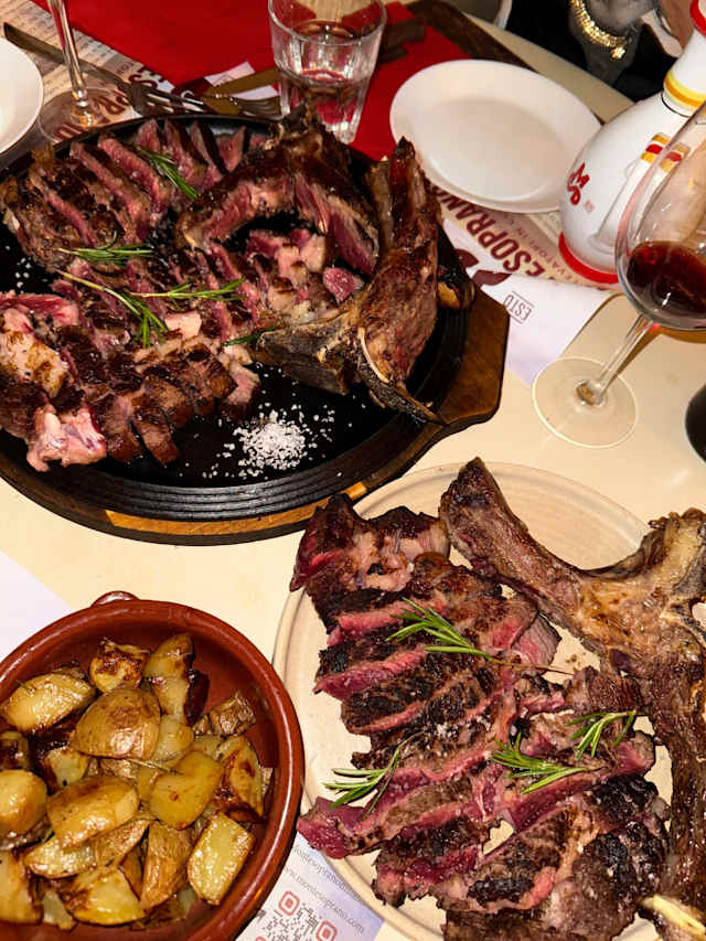 - Pasta al ragù di suino e bovino servito con crema di pecorino, pepe nero e rosmarino