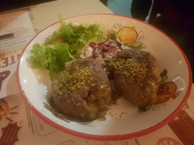 - Polpette di scottona con crema di formaggio, primo sale e pesto di pistacchio