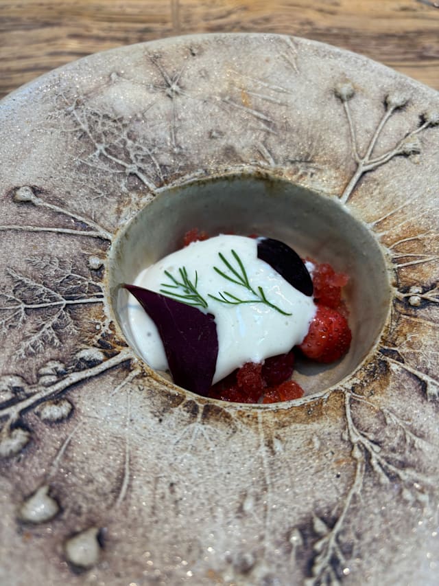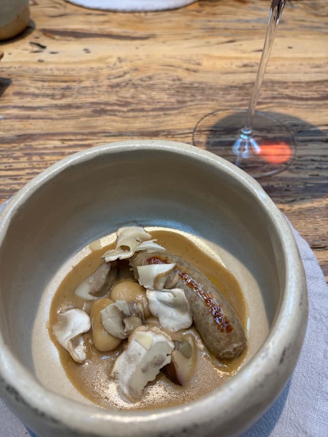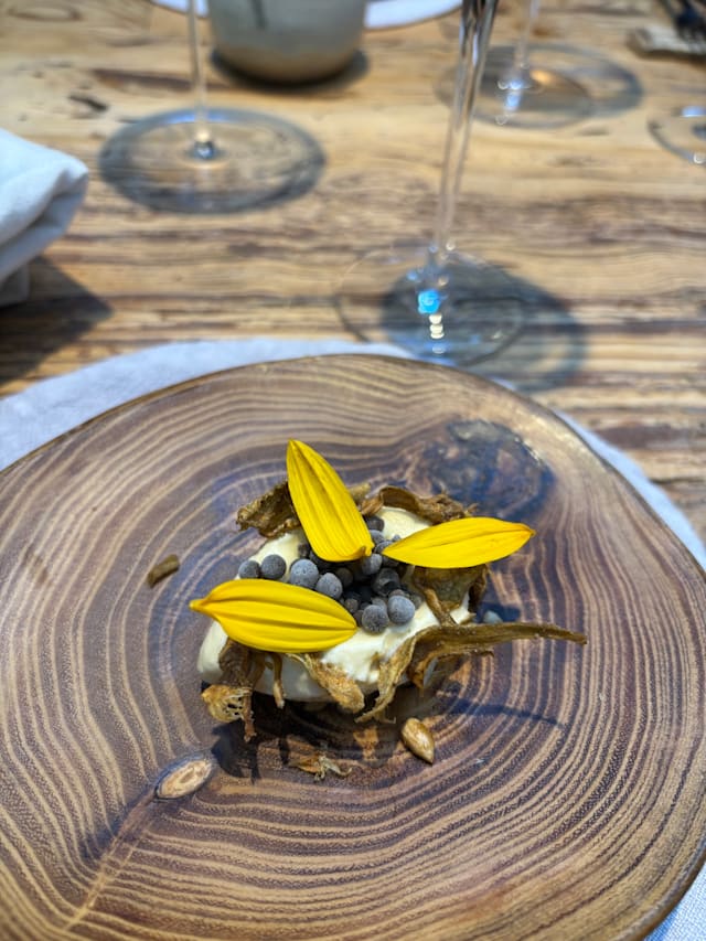 Yema perfecta con demi-glace de champiñón Y huevas de trucha ahumadas