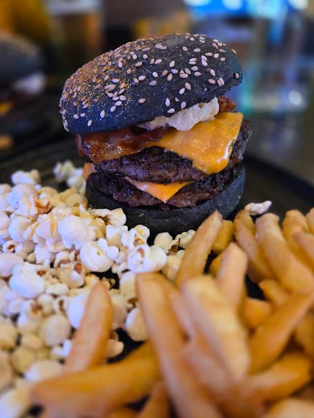 - Black bread , doppia carne , cheddar bacon croccante , salsa pop corn , fontina DOP