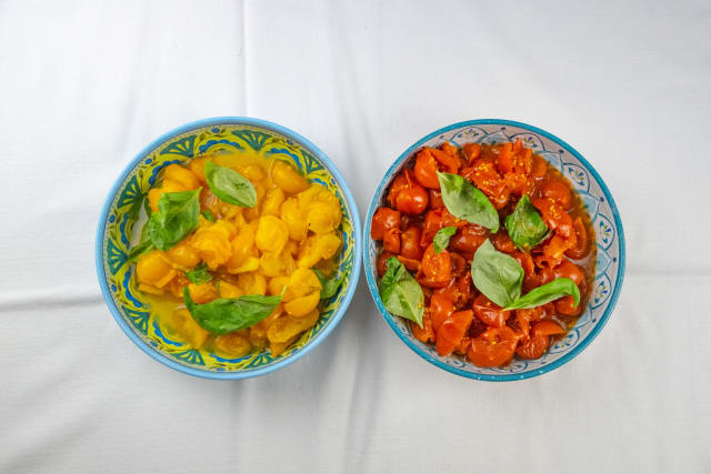 Pomodorini rossi e gialli del piennolo, capperi di Salina, origano di montagna, aglio rosso di Nubia, basilico, olio Evo