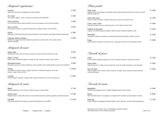 10/10I was curious to have dinner in this restaurant since a while. The menu has interesting highlights and flavors combinations. Moon is located in one of the most vibrant street in Catania. The atmosphere inside is really elegant, the service incredibly attentive and pleasant. Overall our dining experience was very good. I recommend it if you fancy good food, perfect service and an elegant location, that's your place!