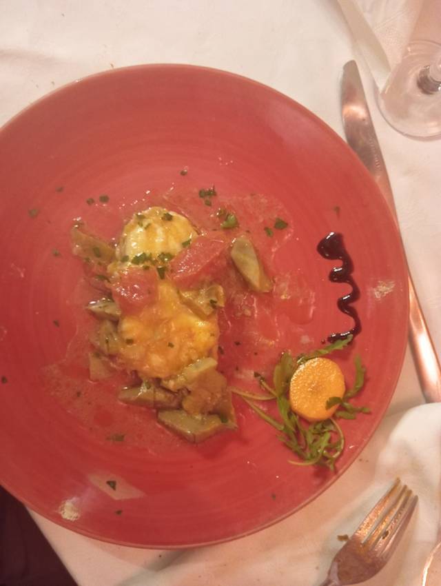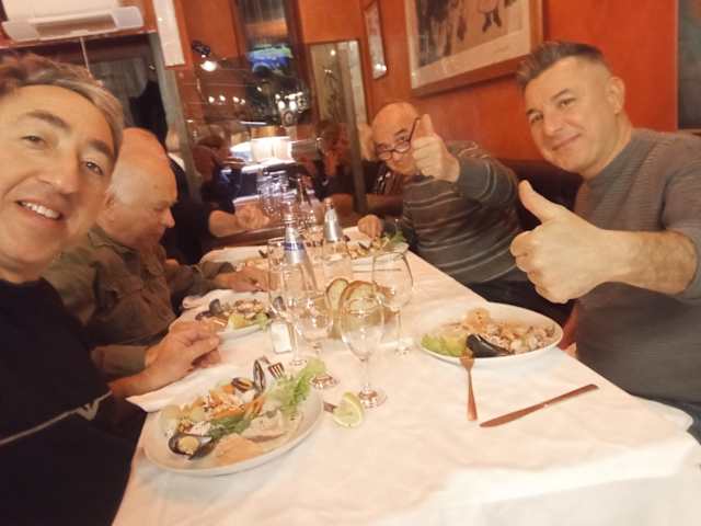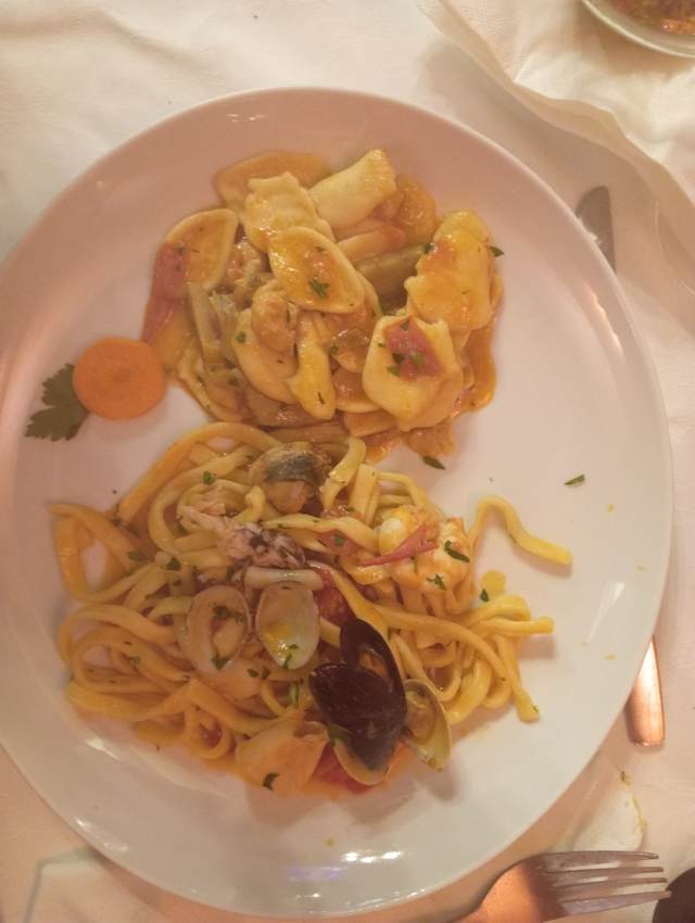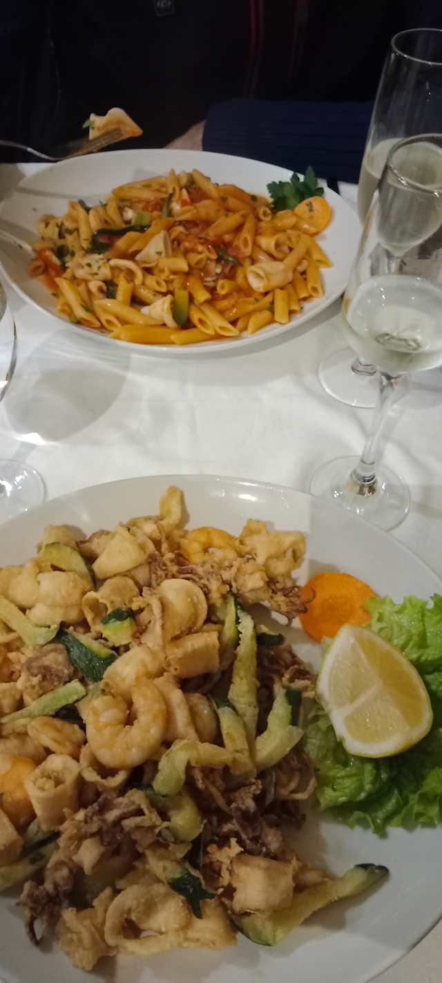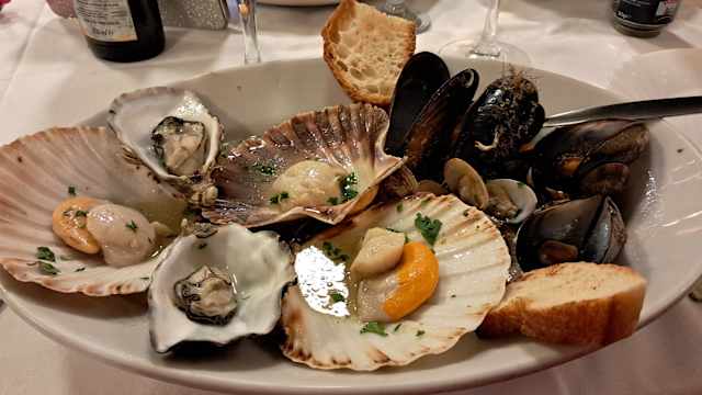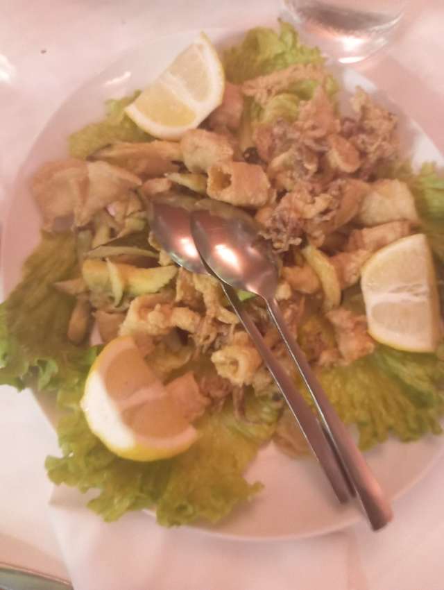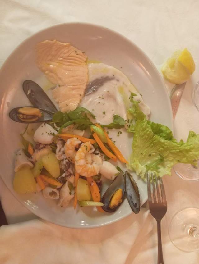 - (Pesce marinato: spada,salmone con inasalata di mare, fritto misto: totani e calamari, capasanta gartinata e crostina di polenta con moscardini in guazzetto)