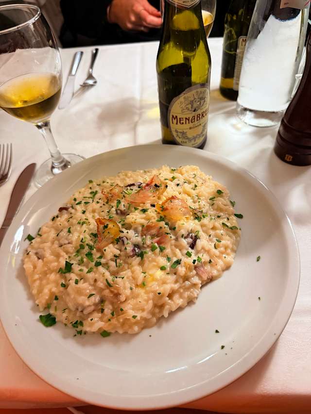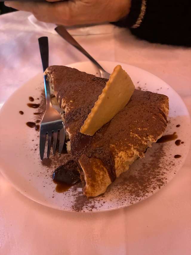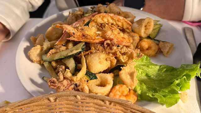 - Pesce marinato: spada,salmone con inasalata di mare, fritto misto: totani e calamari, capasanta gartinata e crostina di polenta con moscardini in guazzetto