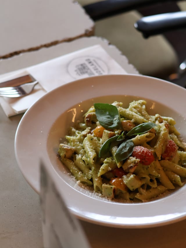 Tender chicken breast tossed with al dente pasta in a rich basil pesto sauce, finished with Parmesan cheese and a touch of olive oil. Served with optional cherry tomatoes.
