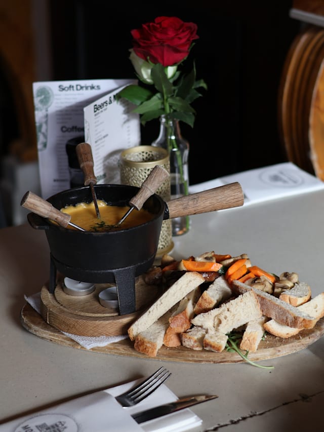 Enjoy melted cheese, l ike Gruyère and Emmental , served with fresh bread and vegetables. Perfect for a cozy evening!