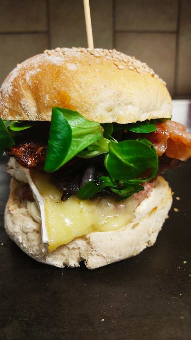 - 150 gr di carne piemontese, brie, cipolle caramellate, insalata, maionese e ketchup. Serviti con patatine fritte comprese nel prezzo