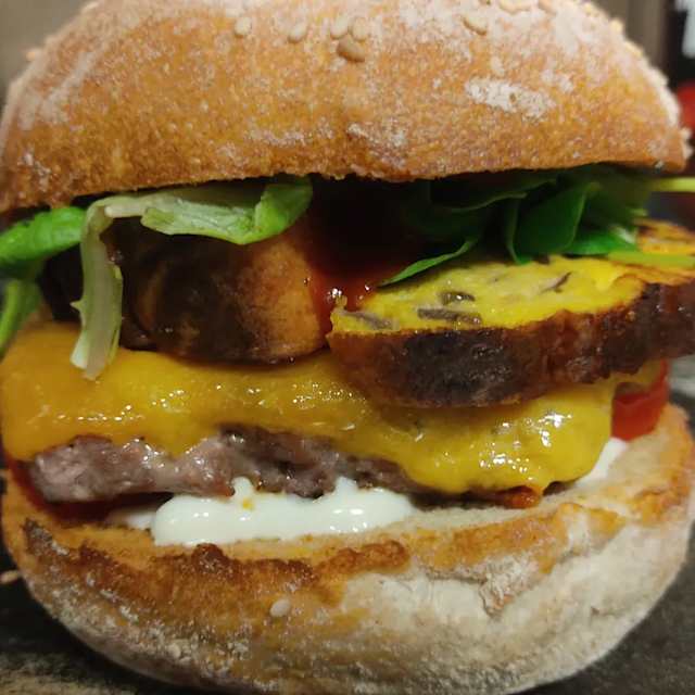 - 150 gr di carne piemontese, cheddar, frittata di cipolle, pomodoro, insalata, maionese e ketchup. Serviti con patatine fritte comprese nel prezzo