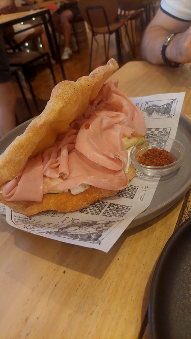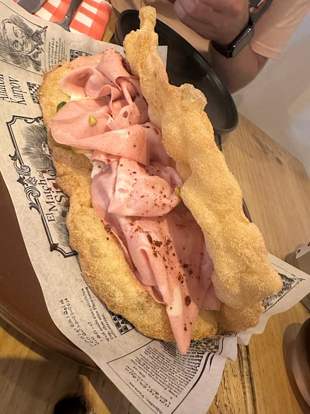 Abierta estilo bocadillo combina mortadella IGP, crema de brócolis salteados con aglio, olio e peperoncino, burratina fresca y ralladura de limon. Cremosa, fresca y con un delicado picante que seduce