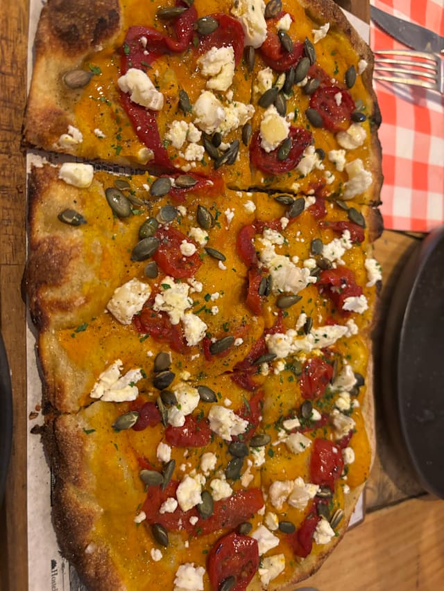 Crema de calabaza asada, pimientos asados, tomatitos semisecos, pipas tostadas y queso de cabra