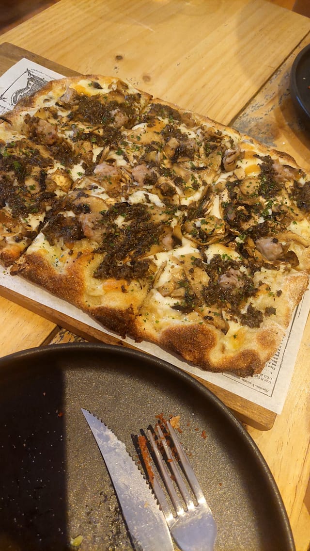 Cuando el frio aprieta, esta pizza es tu armadura: Mozzarella, champis, cremosa yema de huevo con pecorino romano, chips de salame finocchiona y un toque marino de bottarga.