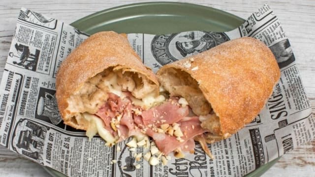 Rellena de mozzarella, jamón york, champiñones frescos y yema de huevo con queso pecorino. Un bocado cremoso y reconfortante...Unos de nuestros grandes clasicos.