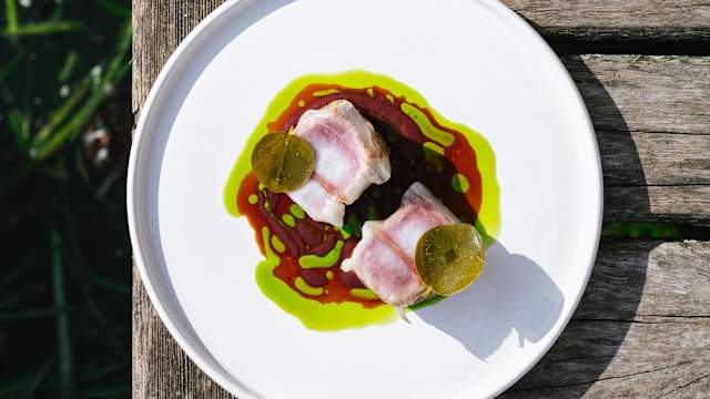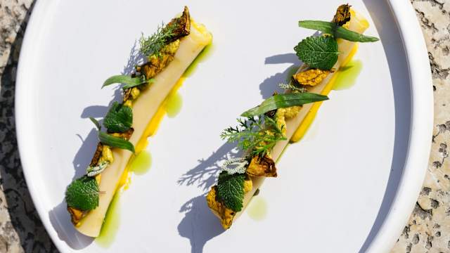 - Gambero di san remo, wasabi di campo ostrica, dragoncello, scalogno bao, paté di pesce di lago bagnacauda d’ alghe e radici