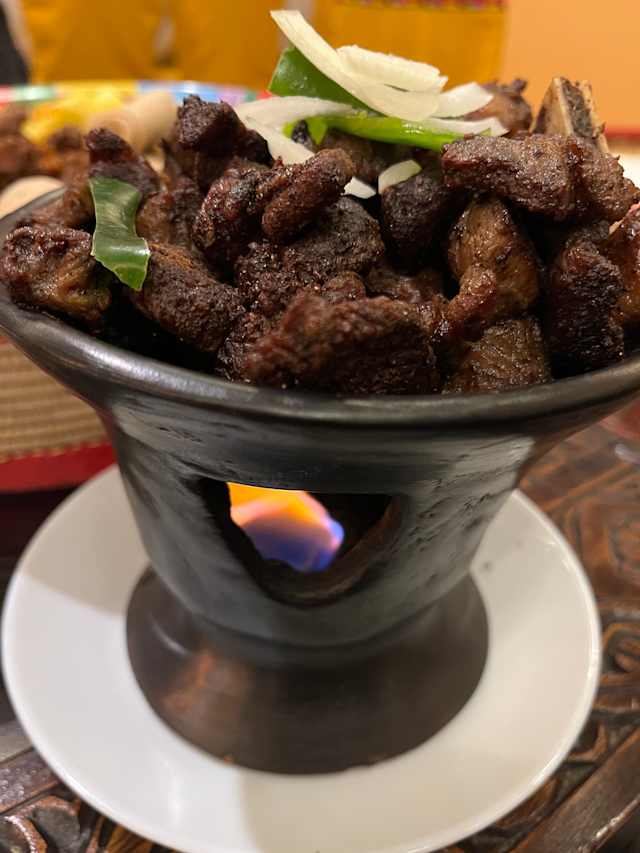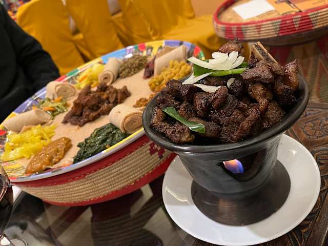 Carne secca di pecora, aglio, peperoncino, injera, spezie e carne di manzo