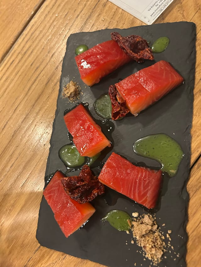 6.5/10Nice little wine shop serving tasty small plates. Unfortunately on the evening we visited the restaurant was virtually empty so the atmosphere wasn’t great. The staff are clearly wine lovers and helped us through the extensive wine list. We had four delicious glasses. The accompanying food was almost OK but everything was over-salted. One of choices was the trio of fish tartare. This was also over-salted and, worse, some of the raw prawns hadn’t been properly deveined.