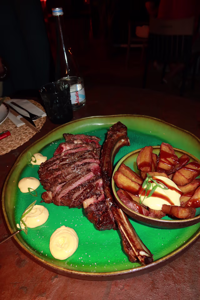 - Tomahawk maturado, batata doce crocante, kewpie mayo e holandês de yuzo