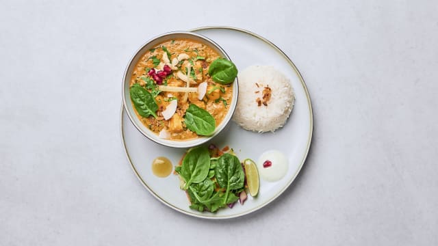 Grilled chicken tikka with veggies, prawn curry, veggie samosa with dip and papdum for extra crunch! Served with rice