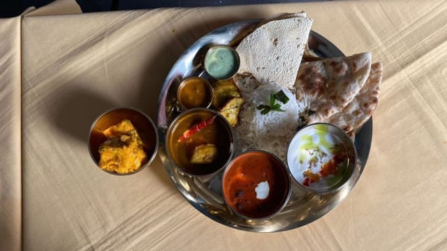 Curry nepalsese Agnello e maile, cima di rapa, aloo ko achar, basmati riso. Dolce , acqua..