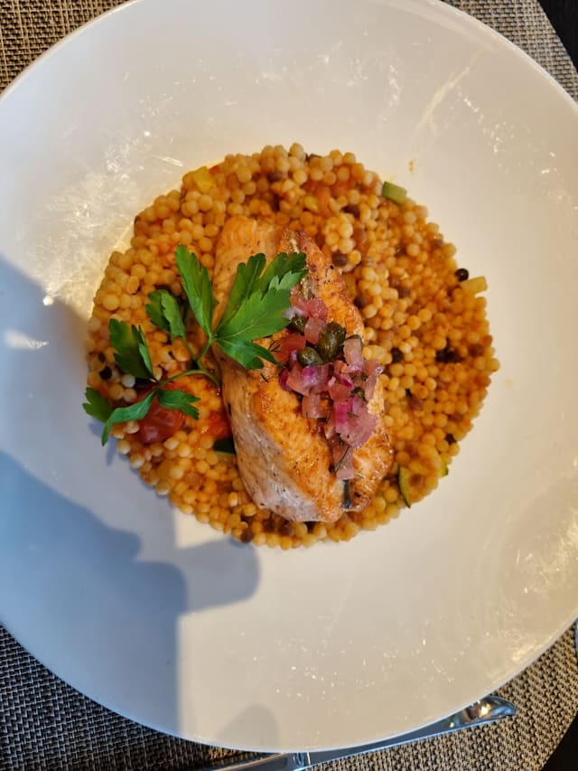 8/10Was a little disappointed when we were informed after we finished eating our appetisers (about an hour later) that the salmon that we ordered had run out (No idea what the kitchen was doing because the order was placed). Wanted catch of the day but that was also not available. Saving grace is the server (Princess)was absolute 5* - very hospitable and advised on alternatives. She was apologetic but I doubt it's any fault of hers. I'm pinning it on the kitchen.