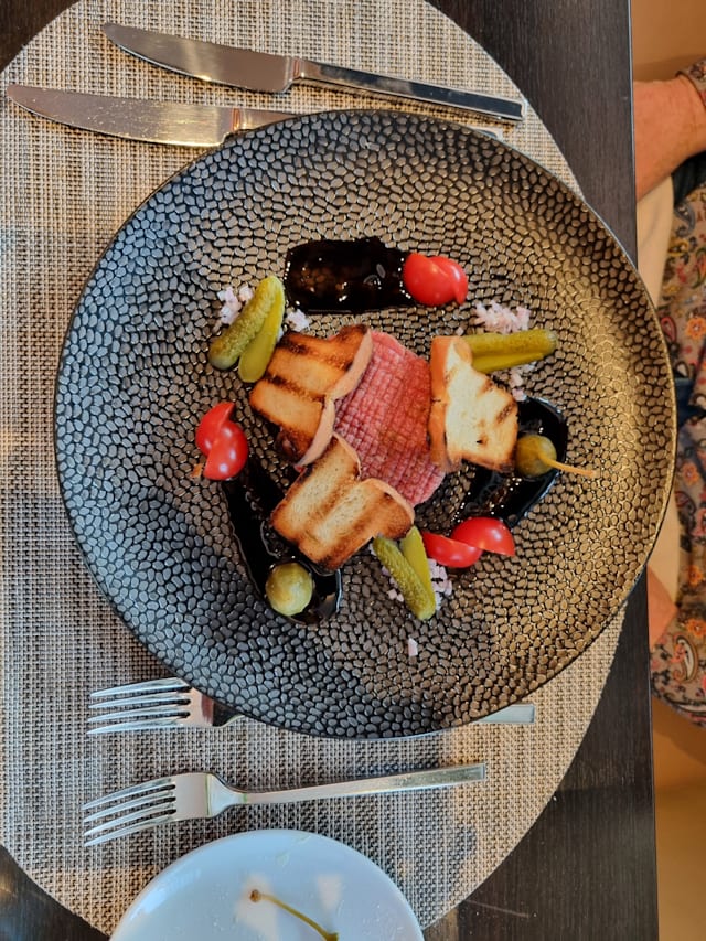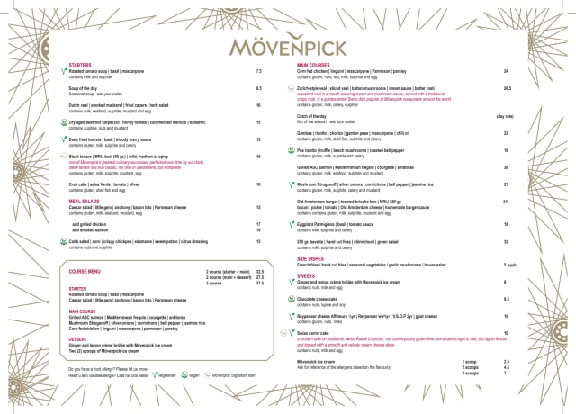 10/10+2We had a splendid dinner at Mövenpick. Very friendly service ( thank you Prince and Ines,and colleagues) We enjoyed the steak tartare,the crab cakes ( please leave the pips out of the olives), and the Caesar salad here is the best in toen. Delicious Catch of the day was a juicy piece of Cod ,and also the Salmon with fregola pasta was very tasty. We could not resist the wonderful icecream they serve here. And I found out a gorgeous combination of Creme Brulee with chocolat icecream. Try it !!