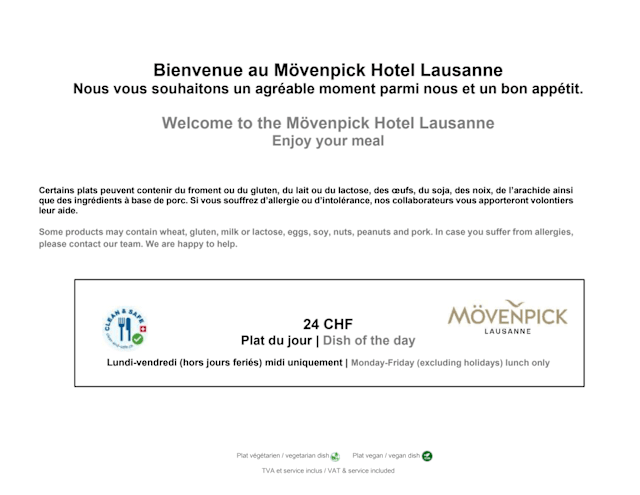 EuropeanFrenchItalianMediterraneanSwissBurgerCevicheperch filletSandwicheSeafood platterTartar steakContemporary cuisineCreativeFrom marketGood for a business lunchGood for familiesOutdoor diningWith friendsNew year's eveValentine's DayHalalLactose intoleranceLocally producedVegan dishesVegetarian dishesAmerican ExpressWheelchair AccessibleWifi