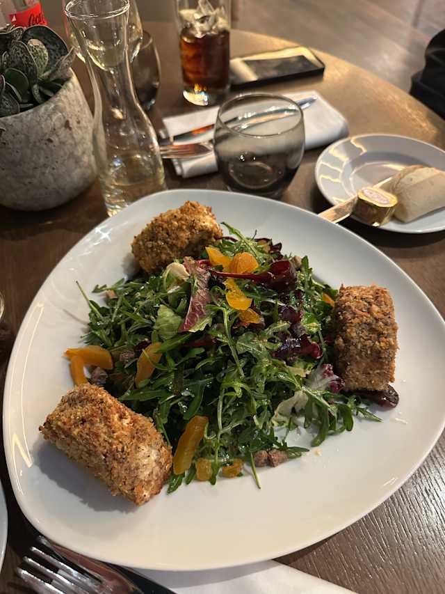 - Chèvre croustillant aux noisettes, petite salade amère de fruits secs et vinaigrette au miel