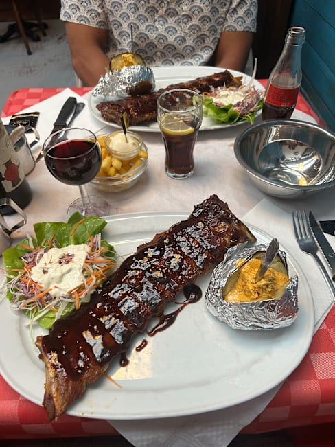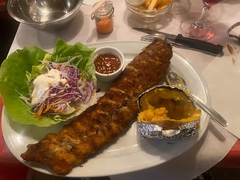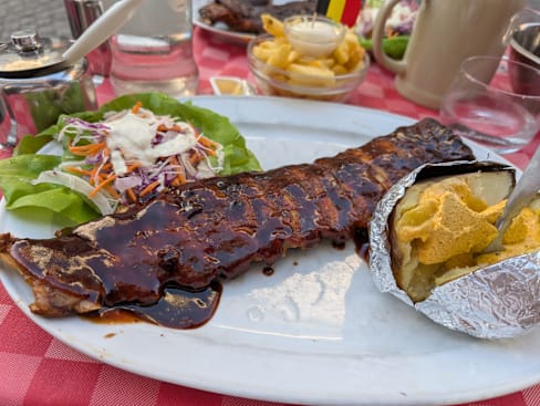 10/10Excellent ribs, very tasty. Chicken skewers were tender, fried shrimps salad was delicious, baked potatos and fries were all lovely. Enjoyed our first meal in Bruges very much, staff and service were excellent too. Thank you.