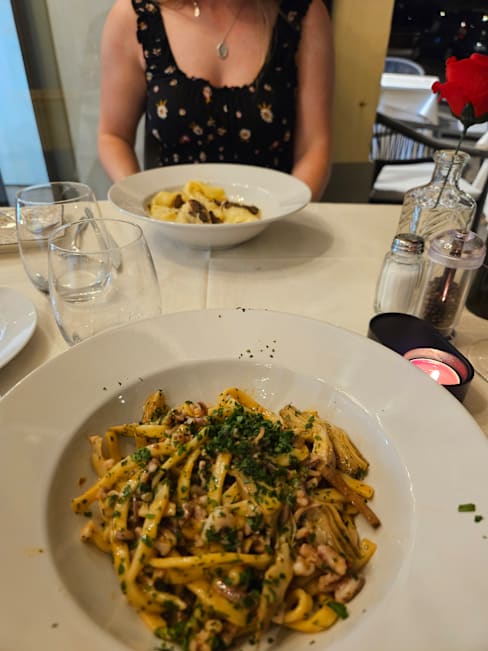 10/10First, the atmosphere is wonderful - along the river, outdoor seating. Salvatore treats you like family and the service is excellent. The fried polenta was so crisp and the pear and rocket salad was perfect. But the best - artichoke stuffed ravioli cooked to perfection. Great wine selection too. This is an authentic Florentine restaurant. It is not in the very center, which is one of its virtues, but it is not a bridge too far either. A short stroll along the river just long enough to feel the calm and enjoy the beauty of the city in the evening. Well done.