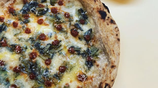 Crema di piselli fatta in casa, pancetta piacentina igp, mozzarella fiordilatte, pecorino, basilico