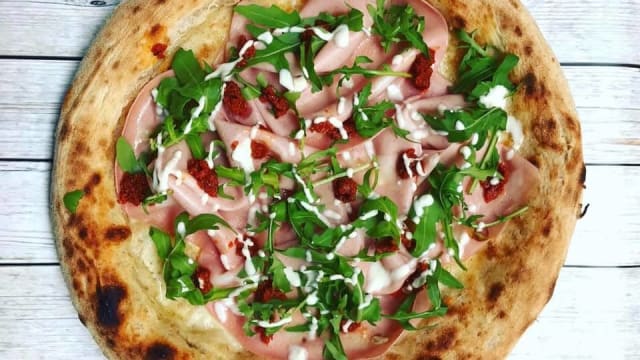 Prosciutto crudo fiocco di parma 24 mesi aggiunto fuori cottura, bufala campana D.O.P aggiunta fuori cottura, salsa di pomodoro, basilico