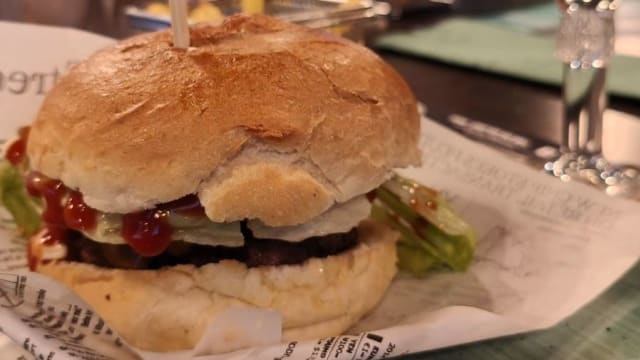 Burger 100% vegetale, salsa avocado, ranch dressing, pomodoro e iceberg trifolata e cipollata caramellata e sempre servito con patate fritte.