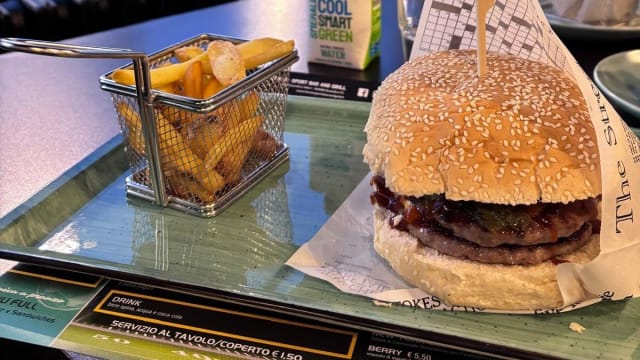 Tutto super 'smashato' con cheddar, pomodoro, lattuga in foglia, cipolla, cetriolini, ketchup e maio.. tutto schiacciato !!!!!!! ( 1 hamburger).. e sempre servito con patate fritte.