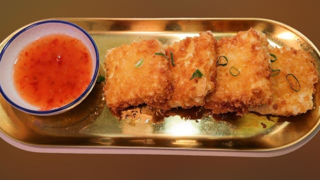 Tofu frito acompanha molho agridoce.