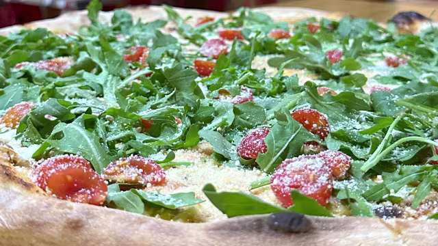 love the taste, plenty of topping, one pizza could be enough to share between two. But we always order to and take home about 1/2. Reheat at home in a frying pan on low heat (don't use a microwave or oven)