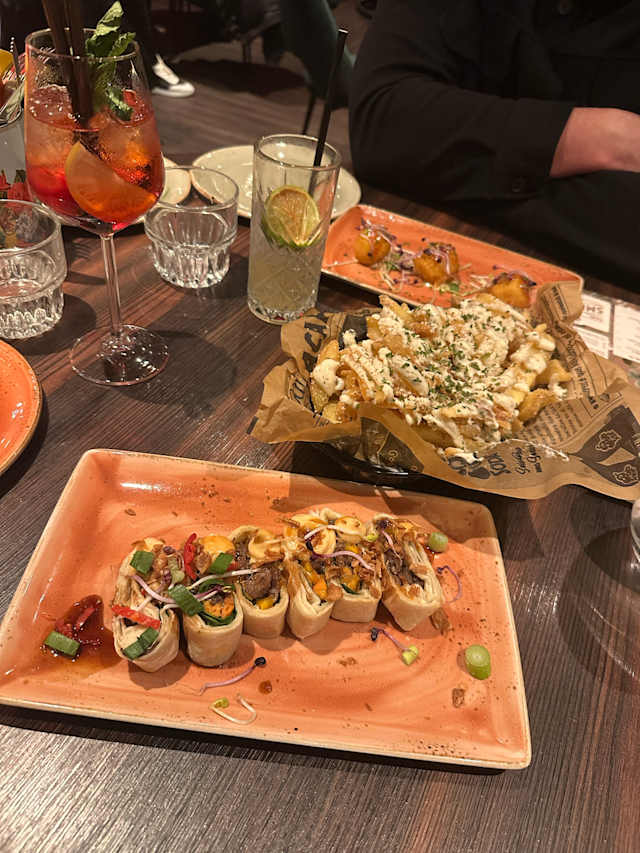 - 2 gefrituurde loempia’s gevuld met ui, prei, wortel, gember, knoflook & glasnoodles. Met huisgemaakte licht pittige oosterse saus
