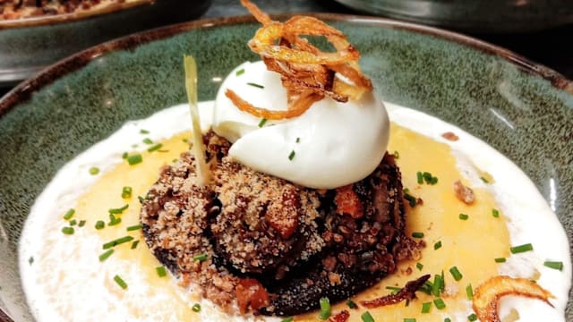 - Servi avec des pommes de terre rôties au beurre et une crème de chorizo.
