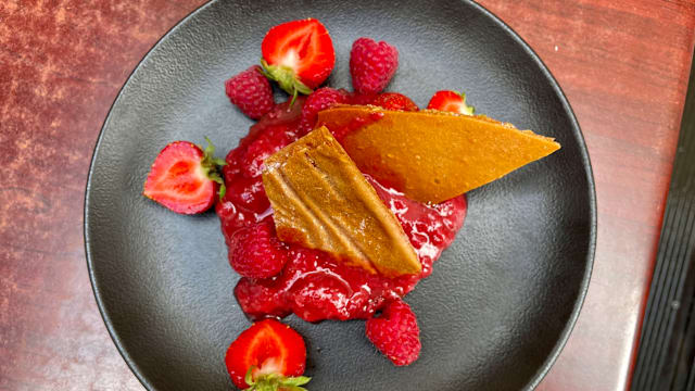- Crème aérienne mascarpone pistache, palet breton, coeur glacé cassis.