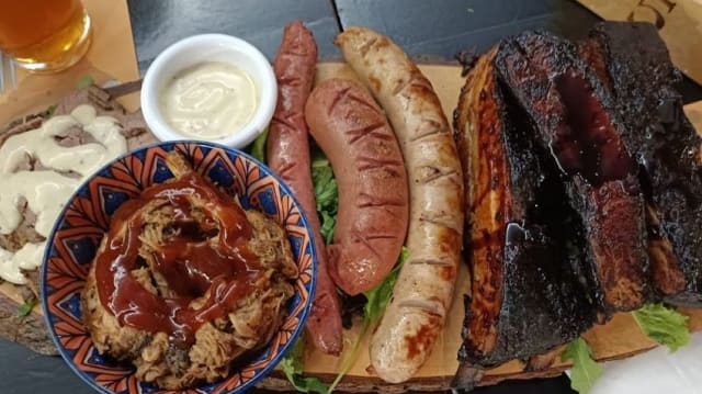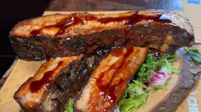Bun artigianale, pulled pork fatto al much,salsa pulled, cipolla croccante, cheddar e salsa coleslaw.