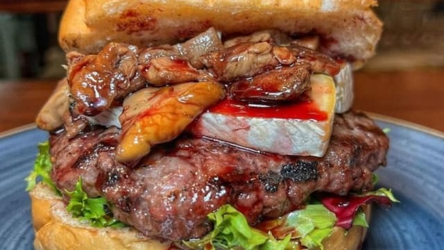 Bun artigianale, burger di manzo selezione much, bacon fatto da noi affumicato al melo, formaggio cheddar , uovo fritto e cipolla caramellata