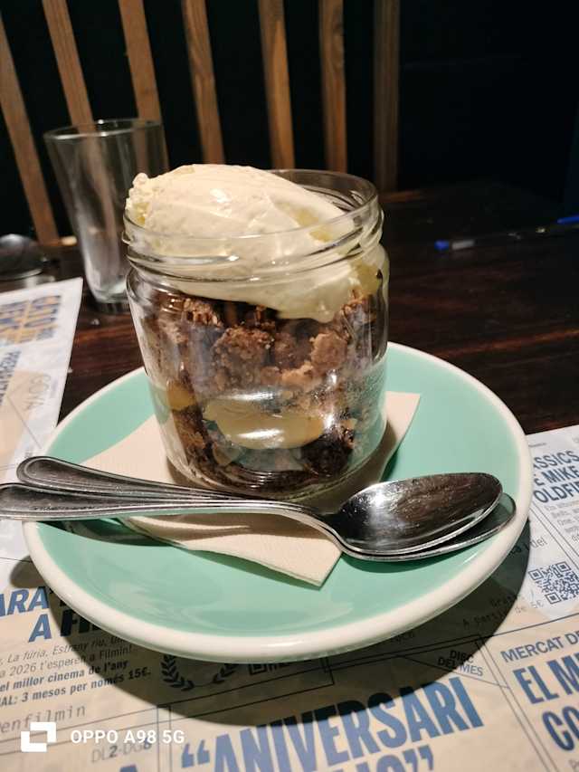 - Postre típic d'uruguay, amb prèssec en almívar, pa de pessic casolà sense gluten, cor de dolç de llet, nata i merenga amb ametlles trossejada