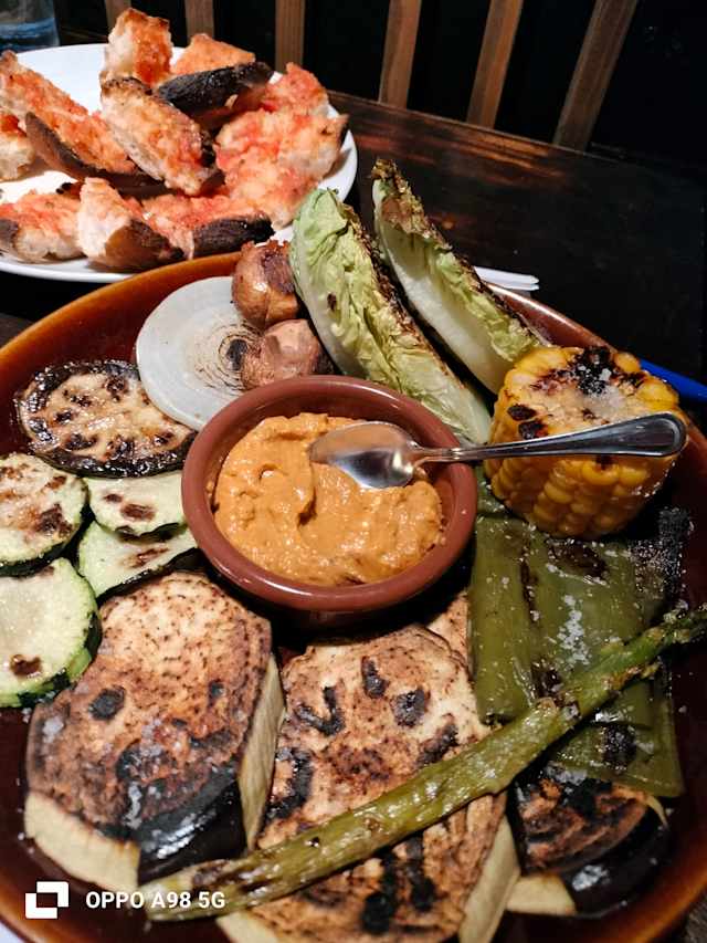 - Espàrrecs verds, albergínia, pebrot verd, ceba i formatge amb salsa de calçots