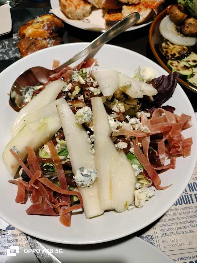- Formatge blau, pernil salat, mezclum, fruits secs i dàtils amb vinagreta de pera al forn