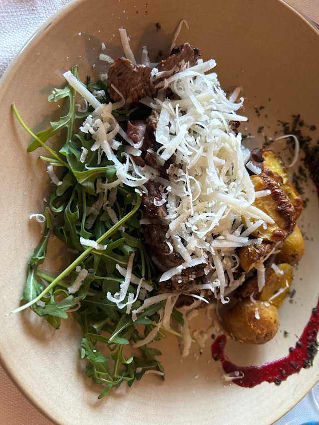 - Tagliata di angus con caponata di verdure, uvetta sultanina e basilico fresco