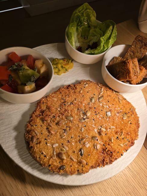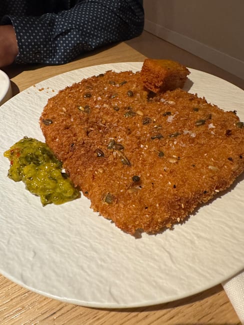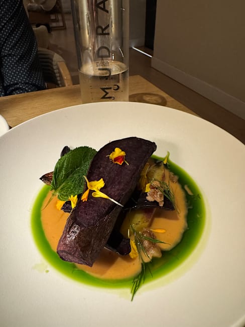 7.5/10Good and partly also surprising flavors (Carrots with Demi glace and sweet potatoe was great!), Sushi with Passion fruit surprisingly fresh. Schnitzel for 2 was crispy, but a bit fatty, especially the potatoes, while the tomatoe salad and lettuce did add freshness, the whole dish did not meet the seasoning spicks from the appetizers and all in all came over a bit blant. Also the chutney was taste the Schnitzel could have used some sauce (Demi glace). Service was good once it took notice. The ambience is a bit to clean shaven and misses a cozy touch. One can argue nothing distractes from the food, but ultimatly Mudra is not quiet there yet...