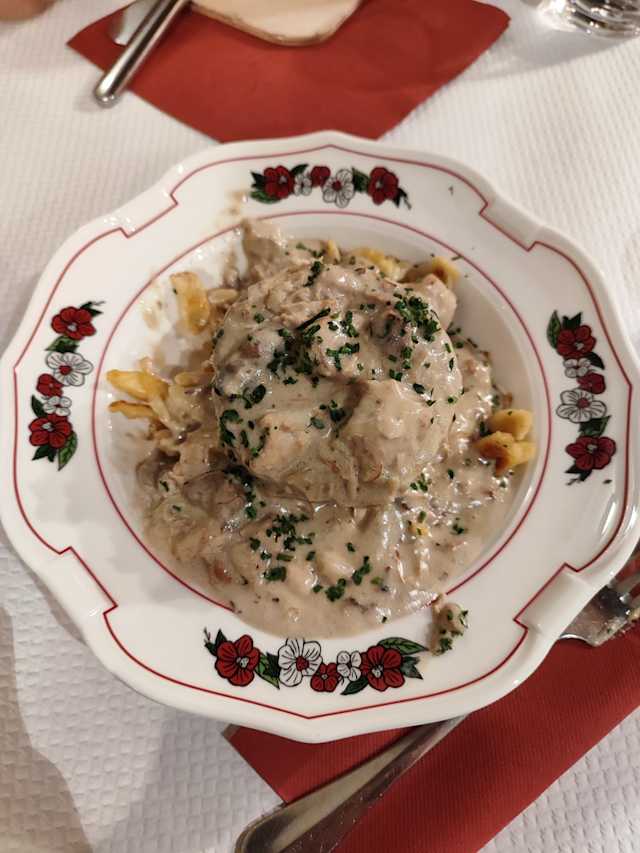 - Fleischkischle (porc&boeuf), sauce crème champignons & spaetzles