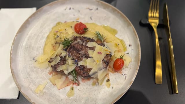 Bovino di scottona, salsa demi glace, purè di patate bio, fiocchi di sale maldon, EVO