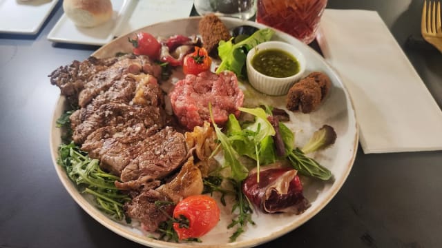 Tartare di fassona, acciughe, capperi, tuorlo d’uovo, mozzarella di bufala campana DOP, senape artigianale, miele di castagno, basilico cristallizzato, EVO
