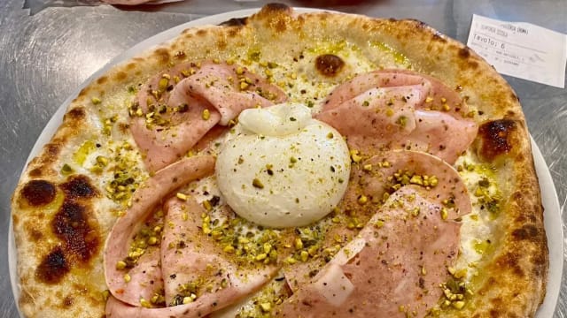 Mortadella, stracciatella di bufala campana DOP, granella di pistacchio di bronte, pesto di pistacchio di bronte, olio al tartufo, basilico cristallizzato