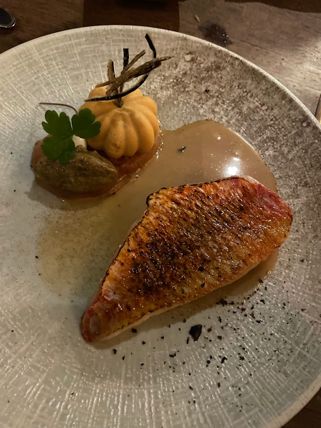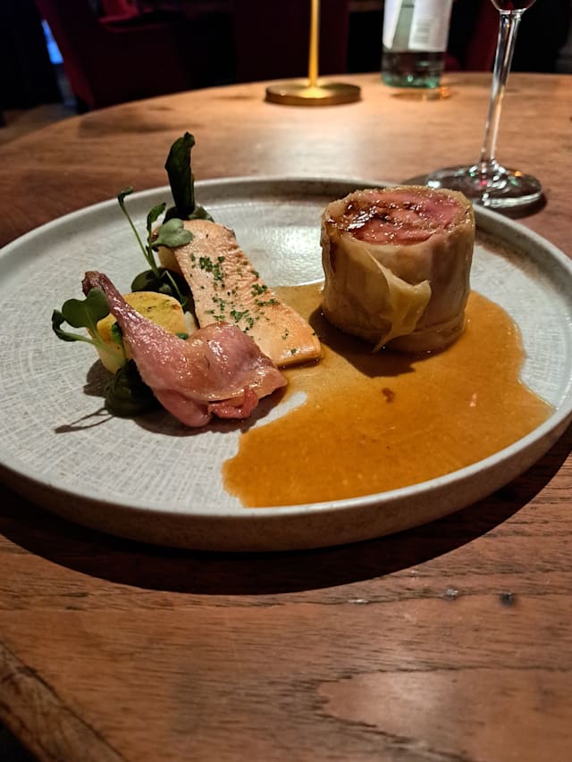 Gebakken zwezerik gelakt met madeira, zacht gegaarde kalfswang met diverse bereidingen van wortel en saus van madeira